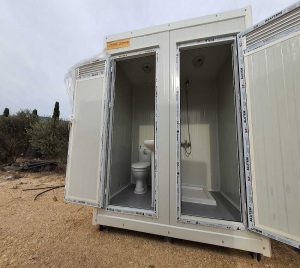 מבנה השירותים בנוי מפאנל מבודד איכותי ומאובזר בדלת אלומיניום (כולל מנעול פנימי וחיצוני), פתח אוורור, אסלה ומיכל הדחה, כיור וברז לשטיפת ידיים עם צנרת למים חמים וקרים ומראה התלויה מעל לכיור.